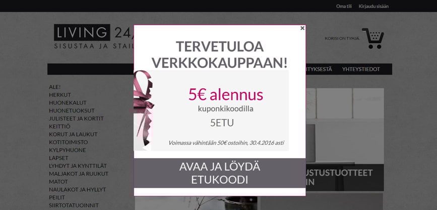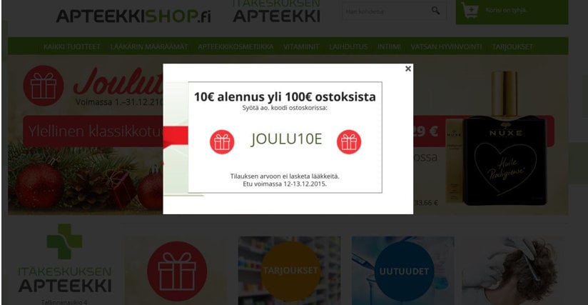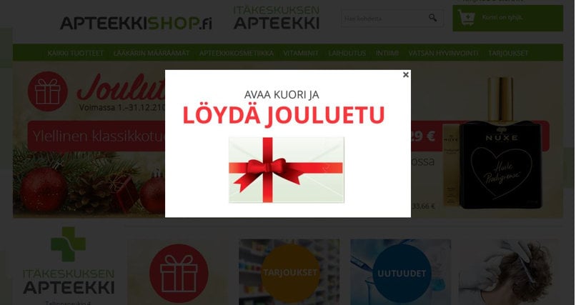 Joulukampanja yllätyskuorella. Taktinen popup-kampanja avautui sivuille tultaessa ja oli voimassa viikonlopun. Etuna käytettiin ostoksen kokoon sidottua alennusta.