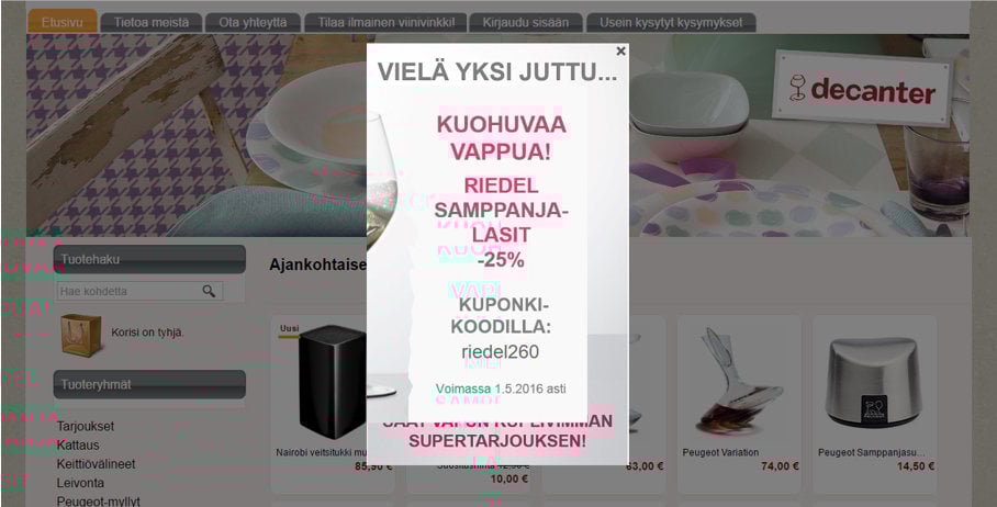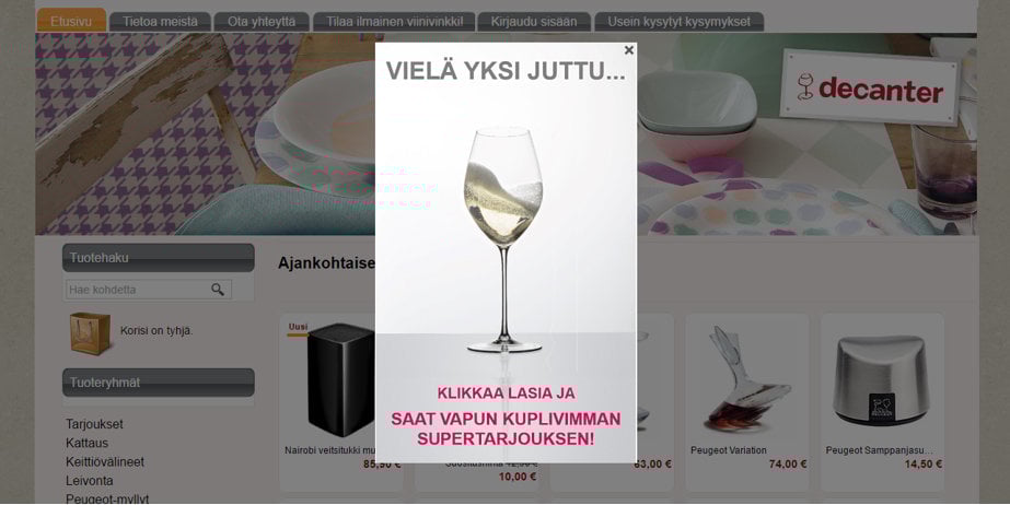 Ystävänpäiväkampanja toteutettiin ns. entry popup –kampanjana, eli se avautui popup-ikkunaan, joka näytettiin sivuston uusille kävijöille. Vappuviikolla Decanter toteutti keväisen yllätyskuoren exit popup –kampanjana, mikä avautui sivustolta poistuville.