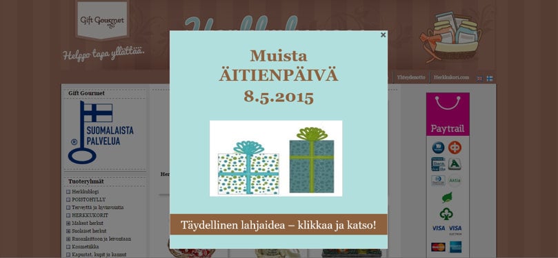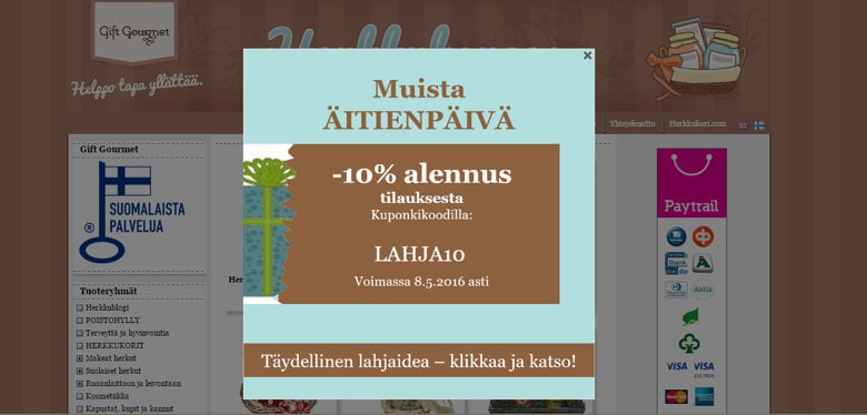 ”Tutustuin Vilkkaan Verkkokaupan jatkotalkoot -koulutuksessa RapidCampaigniin ja innostuin siitä heti. Parasta oli palvelun helppous: mainos toteutettiin nopeasti ja sen voi itse laittaa sivustolle käyntiin. Äitienpäivä on meille osa tärkeää kevään sesonkia. Kampanja osui sopivaan saumaan ja idea lahjapaketista toimii meillä erityisen hyvin.” – Minna Lehtipuu, Gift Gourmet