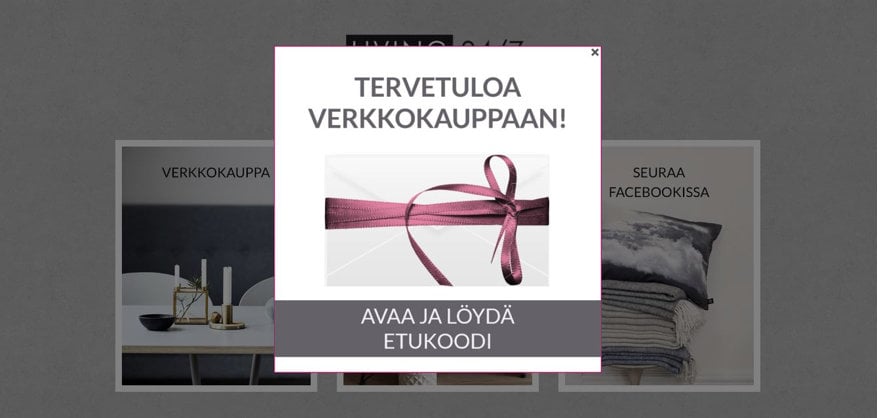 ”Tyylikäs yllätyskuorikampanja! Toteuttaminen oli vaivatonta Vilkas ePages-kauppaani – kopioin valmiin rivin koodia ja sain kampanjan julkistettua nopeasti, ilman integrointeja. Suosittelen!” – Pia Uhlbäck, Living 24/7