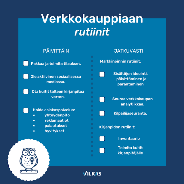 Toisena kantavana teemana verkkokauppiaan jatkuvassa toiminnassa ovat kirjanpitorutiinit. Suosittelemme lämpimästi kirjanpidon ulkoistamista, sillä se vapauttaa aikaa ja jaksamista yrittäjän muutenkin kiireisestä arjesta. Ammattilaisten asiantuntemuksen hyödyntäminen on muutenkin kannattavaa, sillä siten virheet on helpompi välttää ja yrityksen kirjanpito tulee varmasti hoidettua. Vaikka käyttäisitkin kirjanpidossa kirjanpitäjää, on sinun kuitenkin huolehdittava joistakin kirjanpitoon liittyvistä toiminnoista. Näitä ovat esimerkiksi kuittien ottaminen talteen kirjanpitoa varten ja toimittaminen kirjanpitäjälle sekä varaston inventaarion tekeminen. Myös me Vilkkaalla voimme auttaa sinua kirjanpidon kiemuroiden kanssa! Tutustu kirjanpitopalveluihimme täällä.
