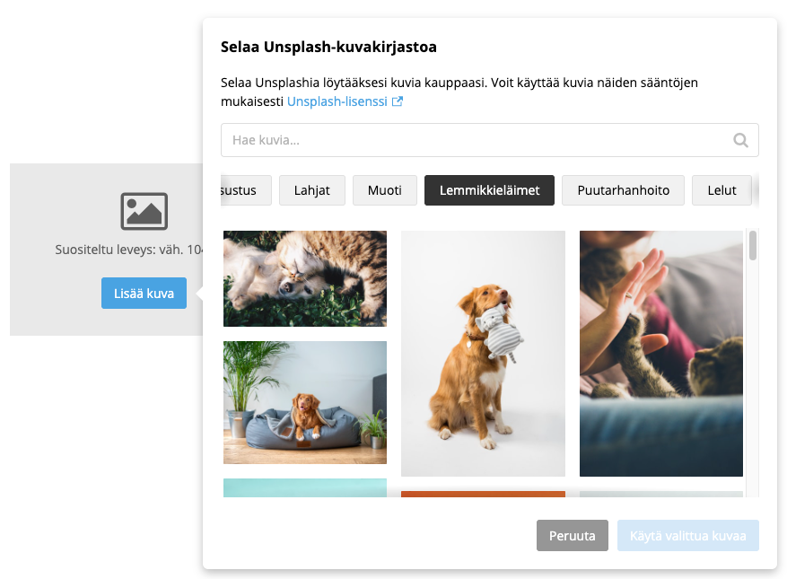 Unsplash-haku tulee näkyviin editorissa automaattisesti kaikissa kohdissa, joissa kauppaan voidaan lisätä kuvia. Erillistä aktivointia ei tarvita.