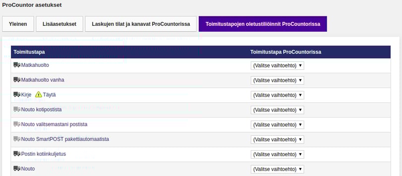 Kuten verkkokaupan maksutavoilla, niin myös toimitustavoilla on samanlainen järjestelmien välinen linkitys. Sivulla näkyy kaikki verkkokauppaan luodut toimitustavat ja alasvetovalikosta valitaan Procountorin laskupohjiin tuleva niitä vastaava arvo. Alasvetovalikossa olevat valinnat ovat: Postitus, Verkossa, Kuriiripalvelu, VR Cargo, Linja-auto, Rahtikuljetus, Noudettava. Nämä tiedot näkyvät siis Procountoriin verkkokaupasta tulevissa laskuissa laskun “Toimitustapa” rivillä.