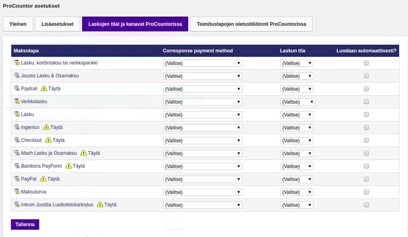 Sivulla näkyy kaikki verkkokauppaan lisätyt maksutavat. Sarakkeessa “Procountorissa” valitaan alasvetovalikosta Procountorissa oleva maksutapa, joka vastaa parhaiten verkkokaupan maksutapaa. Esimerkiksi kaikille online maksutavoille (maksutapa, jossa asiakas maksaa tilauksen heti jonkin maksuoperaattorin palvelussa) valitaan yleensä “Luottokorttiveloitus”. Vastaavasti esimerkiksi verkkokauppiaan omalle laskulle valitaan yleensä “Tilisiirto”.
